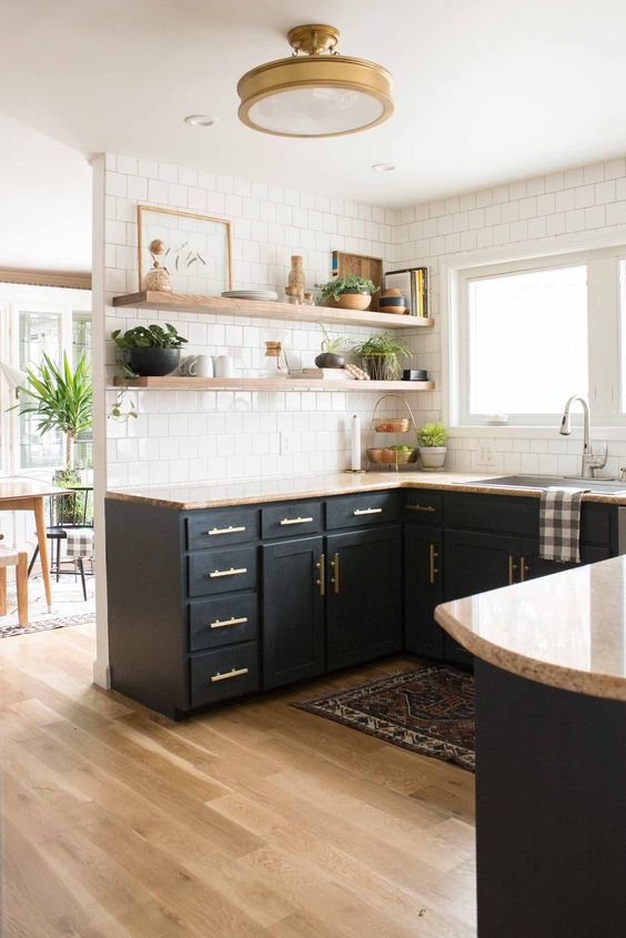 Simply painting the cabinets and installing a nice backsplash can make an outdated kitchen appear brand new. This lovely upgrade above makes the pink-beige granite appear even more lovely since the dark color draws all focus away from it. Removing the upper cabinets is also a wonderful method to give a kitchen a facelift.
