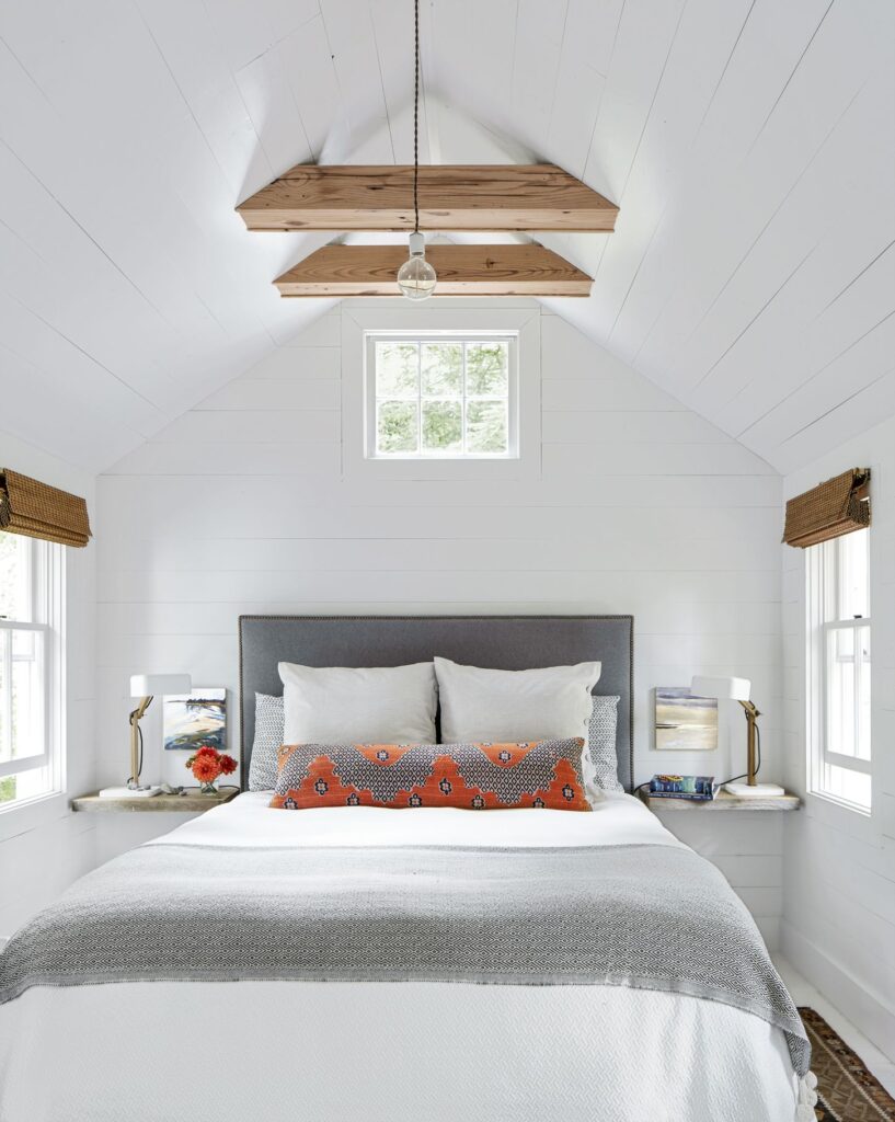 You’d never realize that this bright and spacious all-white bedroom is barely 170 square feet in size! To get this deceptively expansive impression, the planked ceiling, shiplapped walls, and trim were all painted the same bright, clean white.