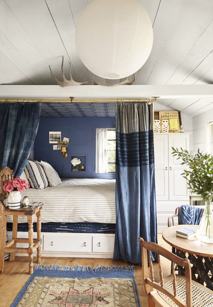 Mate Gallery founders Matt Albiani and Ron Brand converted the modest bedroom of their New York house, Sea Roost, into a lovely seaside refuge by creating a compact captain’s bed, which they then covered with old indigo linens and decorated with an indigo-inspired wallpaper.