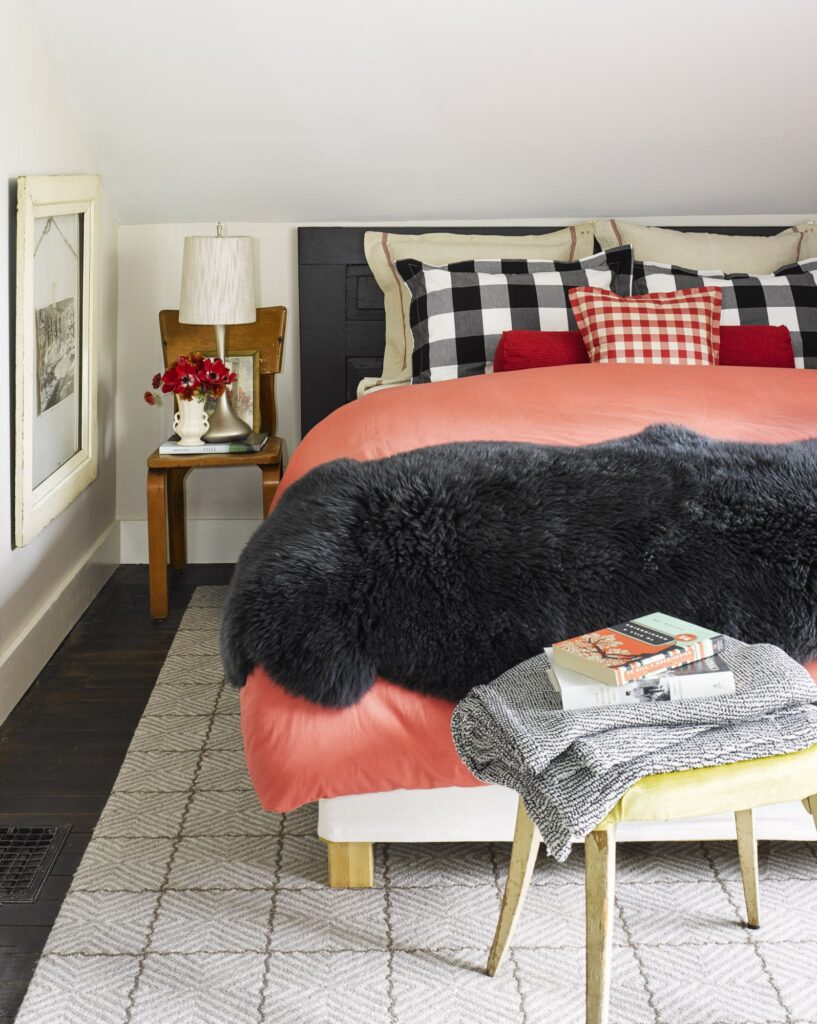 Start by painting your walls and trim a bright white for a bedroom that truly shines, like this Texas guest bedroom. Then add geometric patterns with a rug and an upholstered headboard. Using pure white linen on top of the bed helps the patterns stand out even more. To maintain the style fitted and classy, use items with comparable colors.