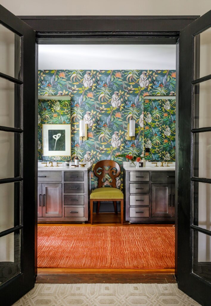 Every room in designer Fitz Pullins’ Florida home is filled with personality, including this bathroom, which has amusing monkey-print wallpaper. “What could be more energizing than a jungle?” Pullins explains. “I want waking up and to brush your teeth to be exciting for me.”