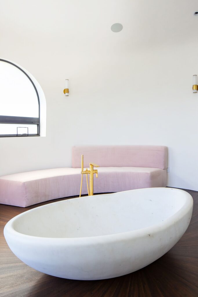 Make it feel even more luxurious by including stylish chairs and a huge floating tub in the middle of the room. Breegan Jane creates a relaxing atmosphere with a recurring circular theme that extends from the rounded corners of the window, sconces, seats, the actual geometry of the room, and beyond.