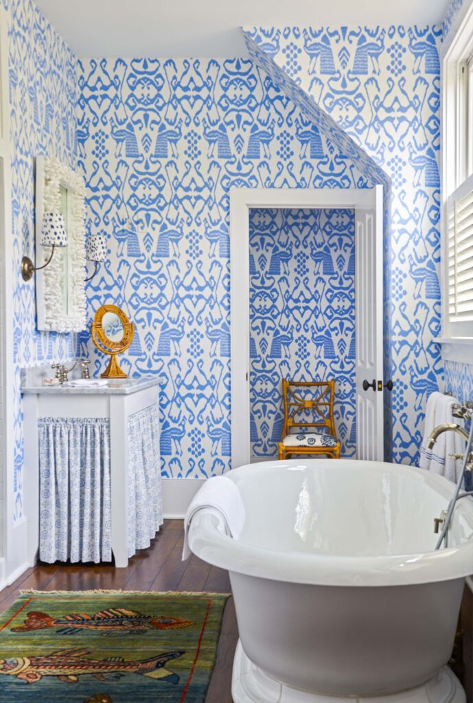 Speaking of pattern-lovers, Charlotte Barnes’ bathroom is a blue-and-white dream, and extending the same Quadrille pattern into the neighboring room creates a pleasing aesthetic.