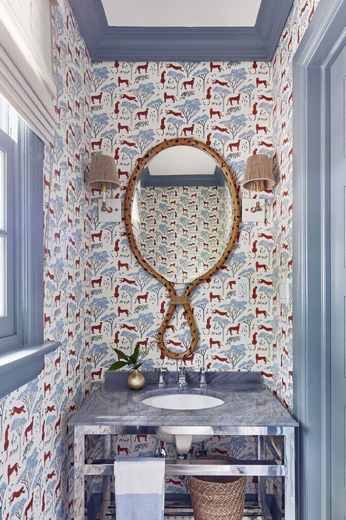 Jessica Geller of Toledo Geller is a print enthusiast, and her love of prints extends to her restrooms. She used a fun design by Hygge & West to cover the walls of the powder room of her own New Jersey house. Proper ventilation ensures that it does not peel away.