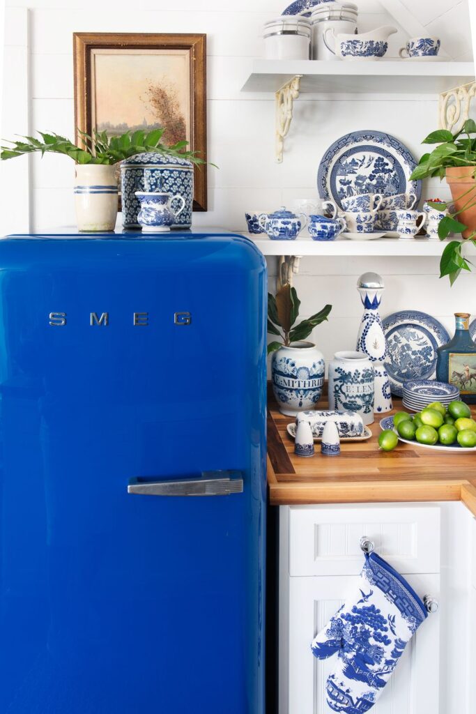 “The retro-inspired Smeg refrigerator offers a nostalgic atmosphere in combination with the vintage Blue Willow dishware and the original shiplap walls,” says designer Lance Thomas of Thomas Guy Interiors. “I love how just laying dishware overflow on the top of the fridge makes the fridge appear to be at home.”