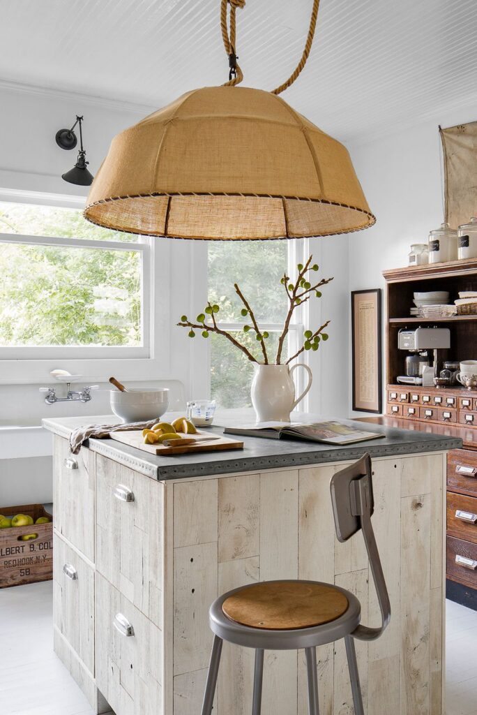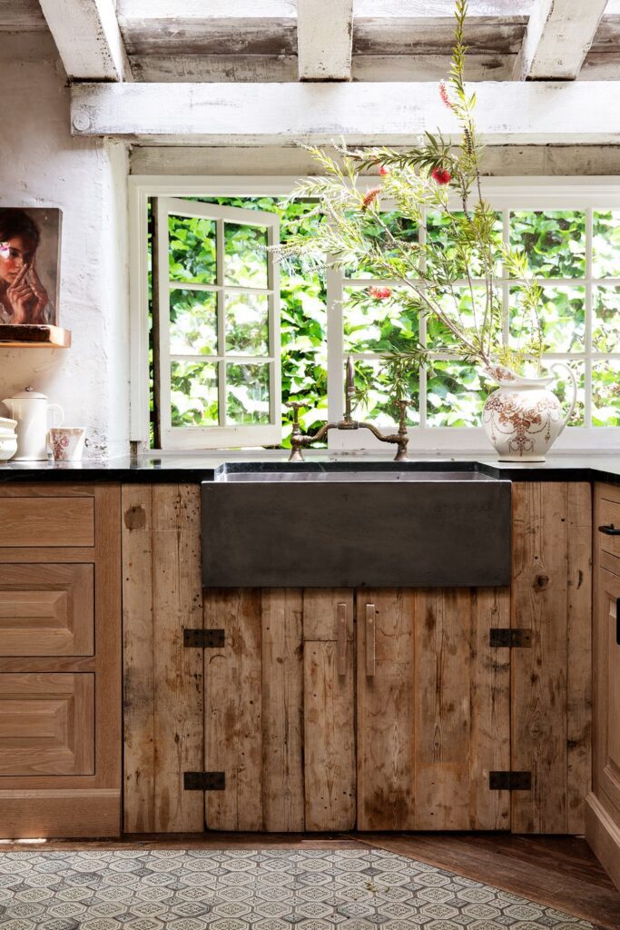 The worn wood beneath the farmhouse sink is really a piece of furniture. “I asked a friend to assist me in cutting up my beloved old table to transform it into the cabinet front,” designer Leanne Ford explains. “This well-loved recycled item gave the kitchen just the perfect amount of spirit.”