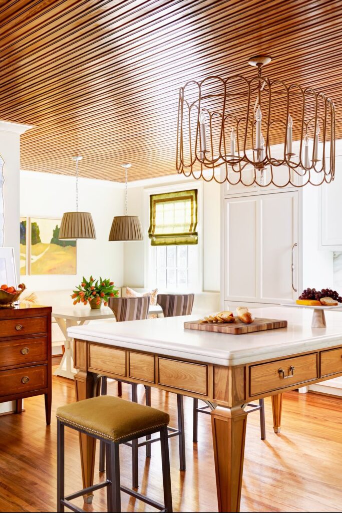 A pecky cypress wood ceiling graces this welcoming Charlotte, NC, kitchen. “My clients, a young, modern family, desired a kitchen that felt like a living area,” designer Gray Walker explains. “The island with a Louis XVI leg adds to the ancient vibe, while the corner banquette has a sleek, contemporary upholstered back and seat with French legs.”